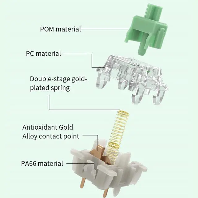 - [Spec] Operating Force: 59±8gf, 35pcs included in each pack, Pre Travel: 2.0±0.5mm, Total Travel: 3.4mm Max, Stem Material: POM, Top Housing Material: PC, Bottom Housing Material: Nylon, Spring: 22mm Dual-stage Gold-plated Spring, LED Support: SMD, Pins: 5-Pin, Pre-lubed: Yes, Keystroke: 80,000,000 cycles