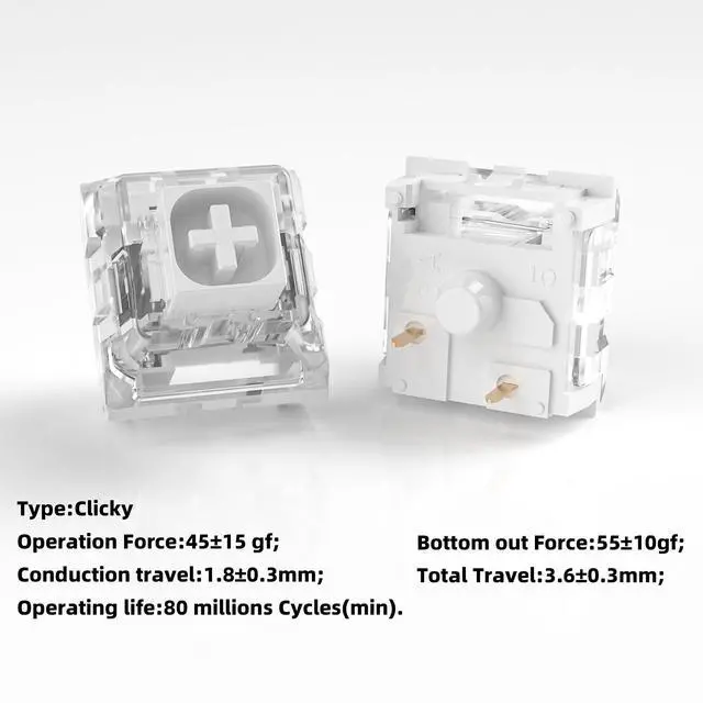 White – Clicky | 1.8±0.3mm Conduction-Travel | 3.6±0.3mm Total-Travel | 45±15gf Operating Force