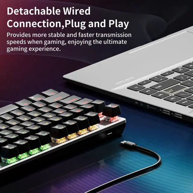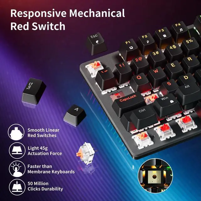 - 4. Smooth Red Switches & Full-Key Rollover Equipped with smooth, linear red switches, this mechanical gaming keyboard delivers ultra-responsive typing and fast actuation, perfect for both competitive gaming and everyday use. Full-key rollover ensures every keystroke is registered, even during rapid-fire actions. Enjoy seamless accuracy and quiet performance with this advanced mechanical keyboard.