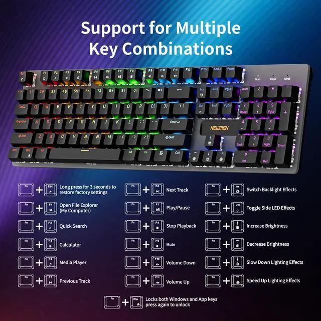 - 5. Smart Shortcuts and Software Customization Access media controls, calculator, and other functions with FN+F1F11 shortcuts. Take it further with customization software that lets you remap keys, record macros, and personalize lighting. Whether youre playing or working, this 104 keys gaming mechanical keyboard adapts to your needsoffering unmatched versatility in a keyboard gaming environment.