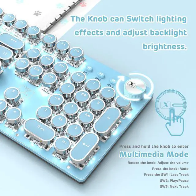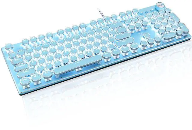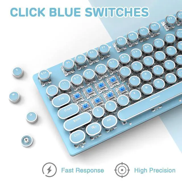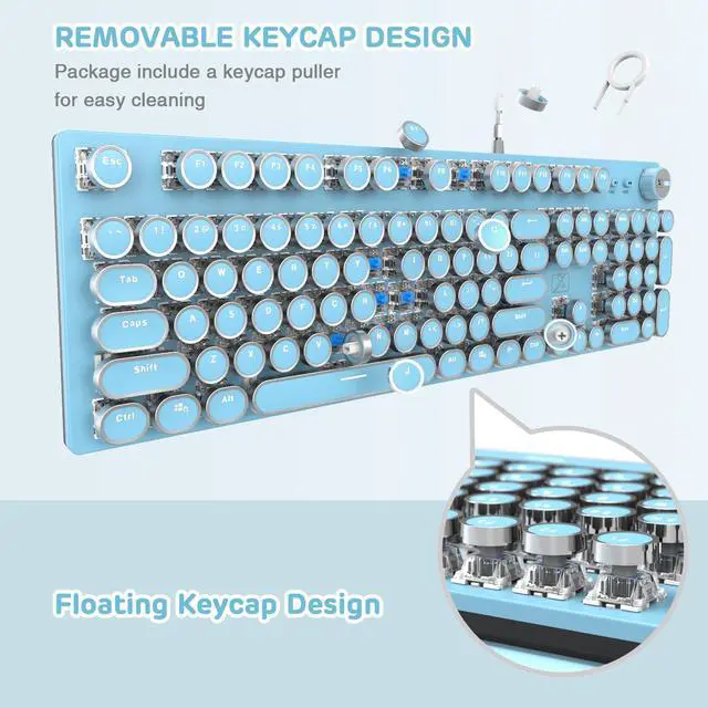 Retro Typewriter Style with Mechanical KeysMechanical blue switch for ultimate gaming and typing performance, offers higher tactical feedback and clearer click sound. Vintage steampunk round keycaps looks like a classical typewriter, brings you comfortable typing feeling & stable clicking touch. Comes with keycap puller for easy keycaps cleaning.