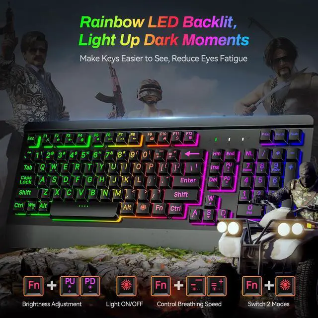 - Wired 7-Color Rainbow Backlit Keyboard,Fun and Vibrant -- The rainbow backlight enhances the gaming atmosphere, making typing in the dark easier. Featuring both steady and breathing backlight modes, you can adjust brightness and backlight speed according to your preference or completely disable the lights. ???????? ?????????????? ?????????????????? ??????????????????, ???????????? ???? ???????????????? ???? ????????????-?????????? ??????????.