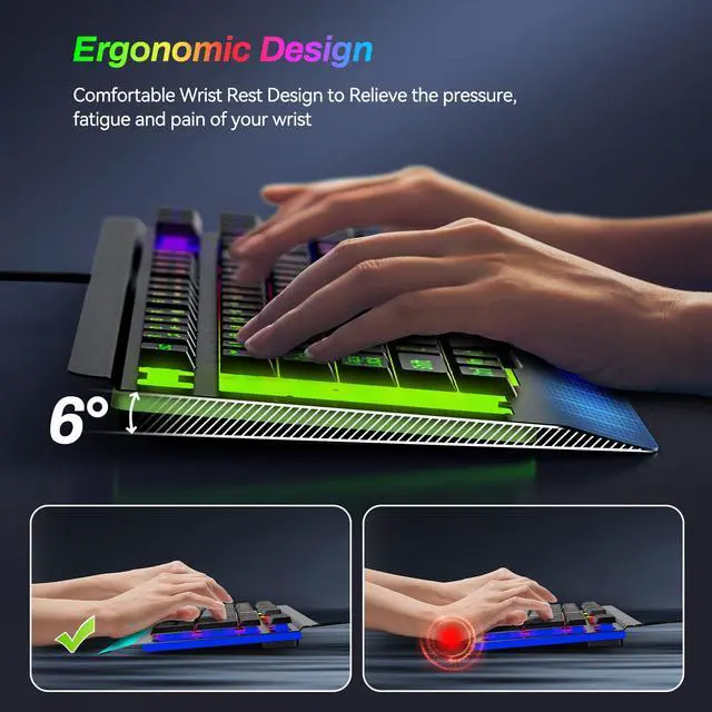 - Ergonomic Design with Wrist Rest,Comfortable for Long Hours --This wired keyboard features a scientific stepped keycap design, maximizing hand comfort during extended gaming or work sessions. It also provides an ergonomic typing angle (6°) and wrist support. All keys offer a soft touch, without loud clicking noises, allowing for late-night typing or gaming without disturbing others.