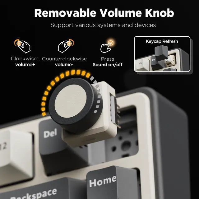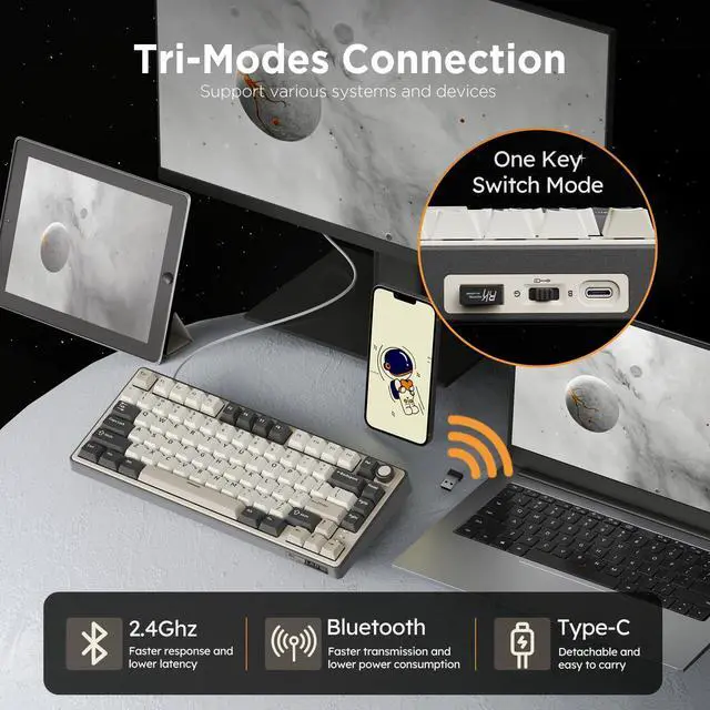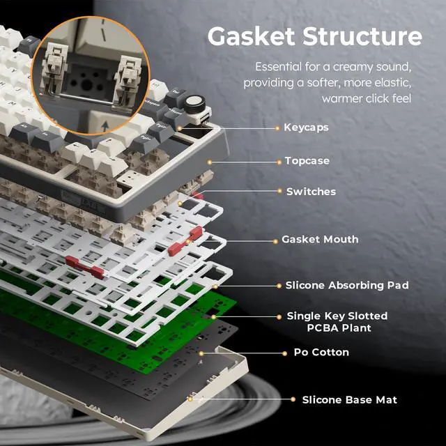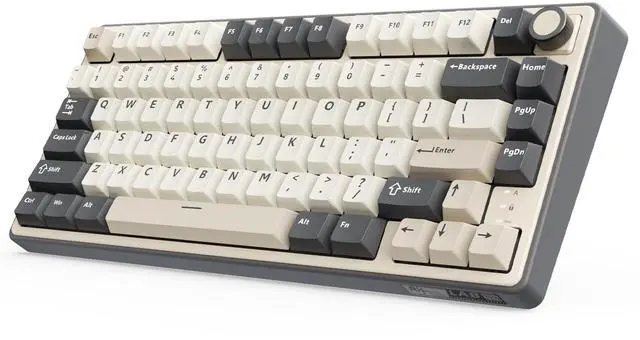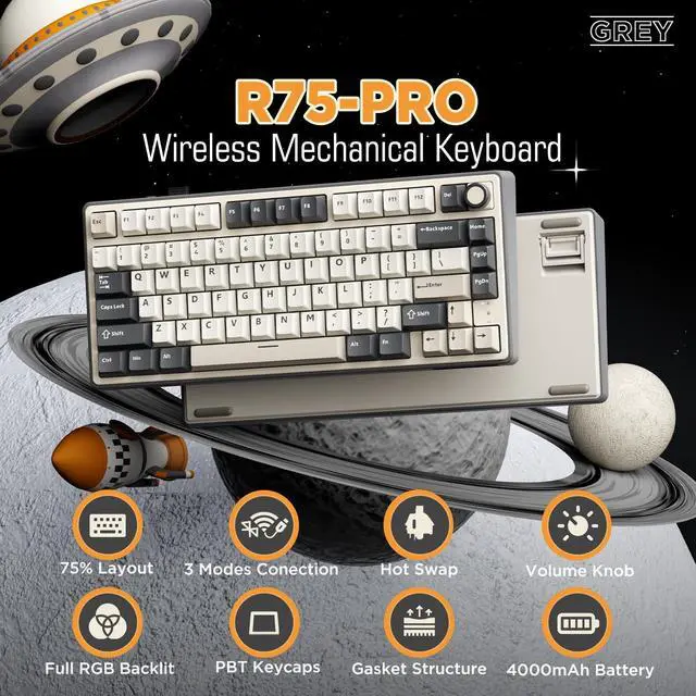 Introducing the R75 Wireless Mechanical Keyboard Gasket RGB Mechanical Keyboard PBT keycaps, Cream Switch. This keyboard is a high-end custom mechanical keyboard with gasket mount mechanical switches. It features a 75% layout and is made of high-quality materials. The keyboard has a gasket mount mechanical design, which provides a more stable typing experience, creamy sound and better acoustics. It also has a brushed aluminum frame and a gasket plate that helps to reduce the noise of the keys.The wireless gaming keyboard offers Bluetooth, 2.4GHz wireless, and wired USB connections. It can connect up to 3 devices. The 4000mAh battery ensures long-lasting and stable use.Supports programmable QMK/VIA, offering more extensive customization and editing functions than traditional software. You can customize the keymap, shortcut keys, backlight effects, etc.