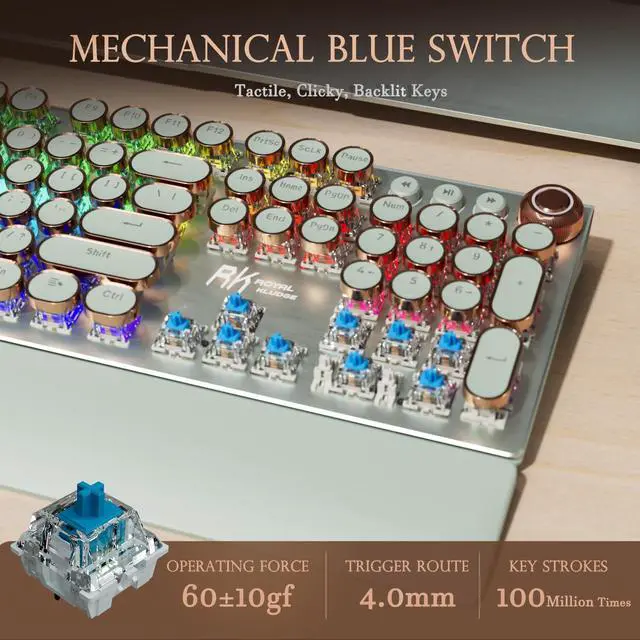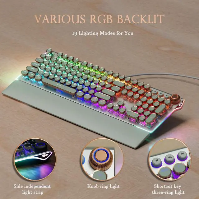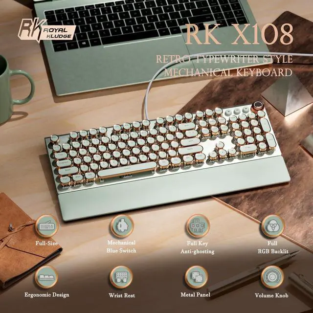 - Inspired by vintage typewriters, X108 combines retro round keys with a durable metal panel for a stylish workspace.