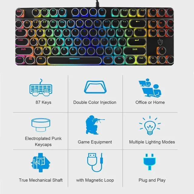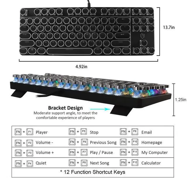 - All 87 keys are conflict-free, with 12 multimedia keys and ergonomic slip-resistant and splash-resistant design