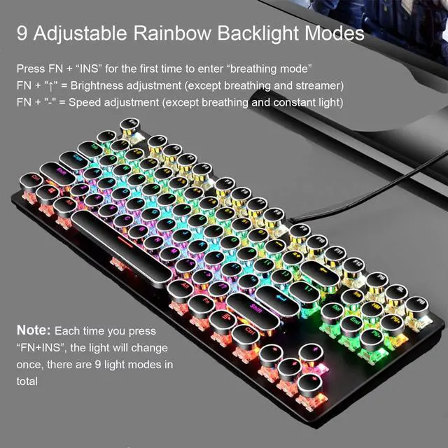 CHUYI mechanical keyboard adopts RGB lighting effect design and 9 different backlight modes to create a cool and colorful gaming atmosphere and enhance the excitement of the game