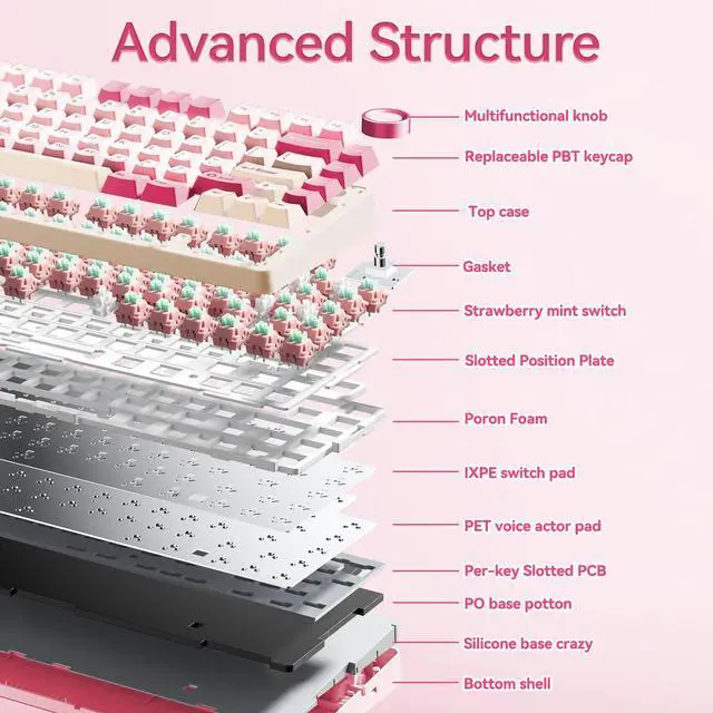Gasket-mounted keyboards offer a softer, more cushioned typing experience by absorbing vibrations and reducing noise. This F75 gaming keyboard ensures consistent key press response across the entire board, enhancing comfort during prolonged use.