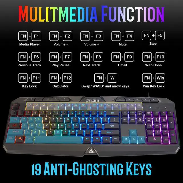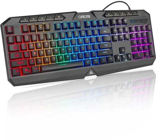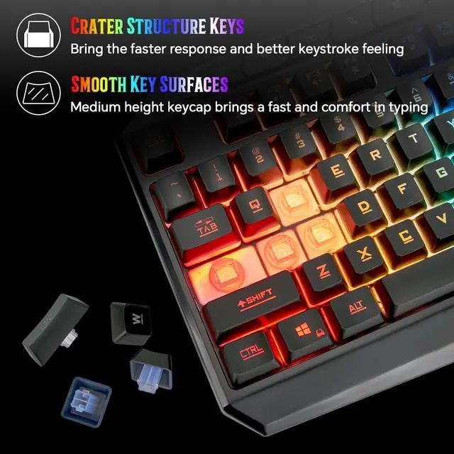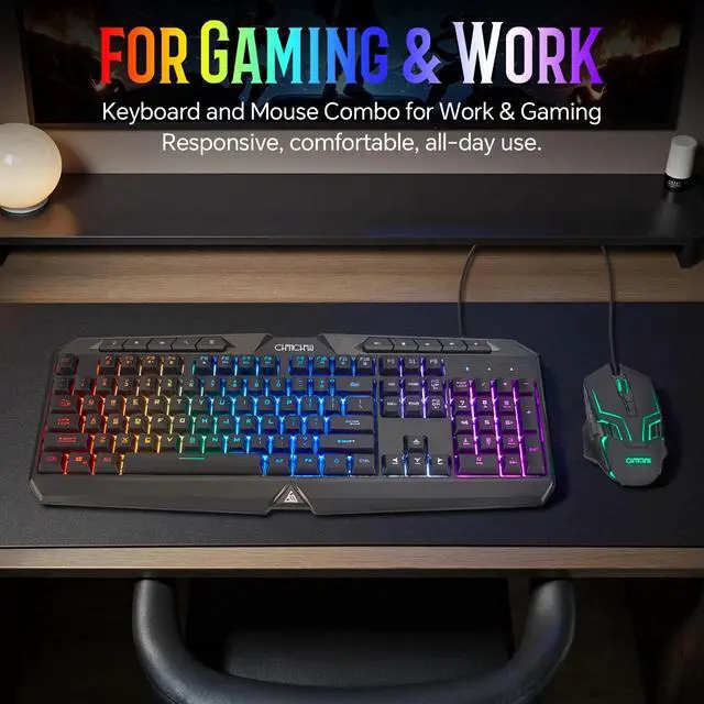 The keyboard features vibrant rainbow backlighting, comfortable and responsive keys, and is engineered for long-hour use without fatigue.