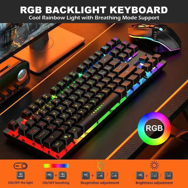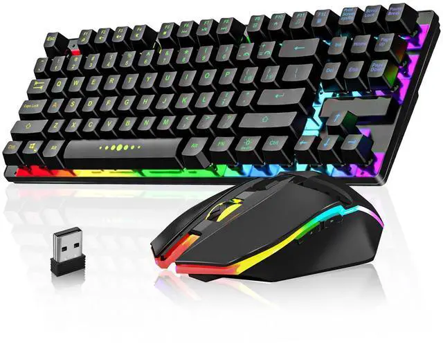 Wireless Gaming Keyboard and Mouse Combo, LED Backlit Rechargeable Battery, Ultra Compact Mechanical Feel Keyboard, RGB Mice for PC Gamer, Business Office, Durable Ergonomic, Wide Compatibility, Black
