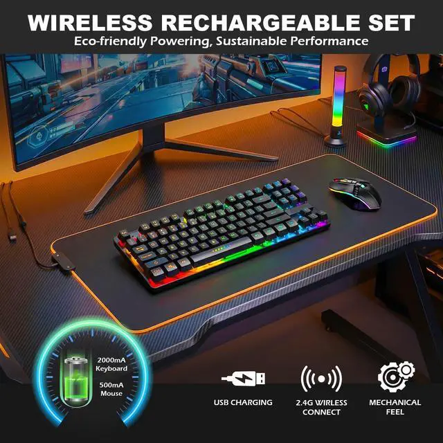 Rechargeable Battery with Long-Lasting PowerThe keyboard features a built-in 2000mAh rechargeable battery, while the mouse is equipped with an 800mAh battery for long-lasting performance. USB recharging reduces the need for disposable batteries, making it ideal for gaming, home, and office use.
