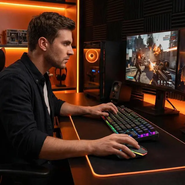 RGB Keyboard with Mechanical-Feel KeysThe ultra-compact keyboard features suspended keycaps that deliver a mechanical-feel response. Rainbow LED backlighting with breathing mode creates a stunning and immersive visual experience.