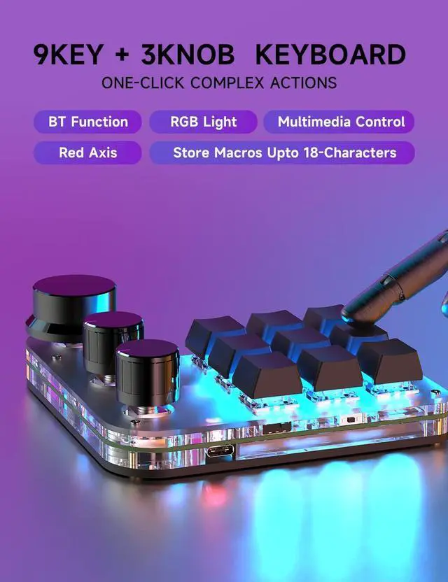 9-Keys USB Mini Keypad, Programming Macro Pad with 3 Knobs, RGB Macro Mechanical Gaming Keyboard for OSU NKRO, Hot-Keys One-Handed Mechanical Keyboard (9Key 2.4G)
