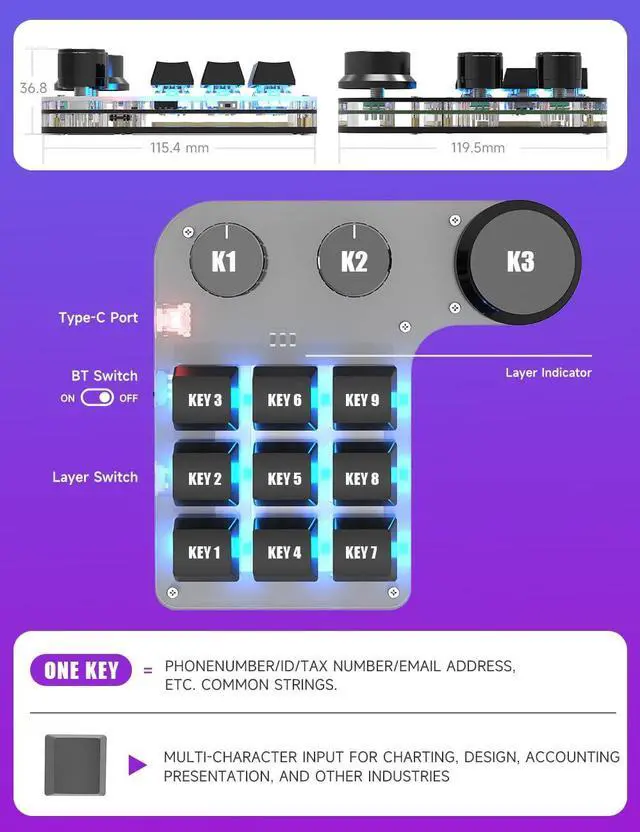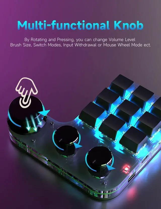 : BRIMFORD mini keypad with macro knobs is perfect for making work faster, plays games smoothly etc. The knobs (Rotate Left/Right, Press Down) is programmable, also can be rotated steplessly (Enter Up To 18-Characters at Once). You can set it as desired to VOLUME+/-, PREVIOUS/NEXT, DECREASE/INCREASE, TURN PAGES FORWARD /BACKWARD etc.