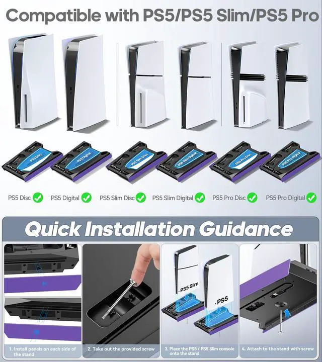 [Perfect Fit for P5/Slim/Pro Console] The P5 cooling station is expertly crafted to seamlessly accommodate the P5, Slim, and Pro models, including both the Disc and Digital editions. It comes with screws to firmly attach the console, offering robust scratch protection and ensuring it remains stable on the vertical stand.