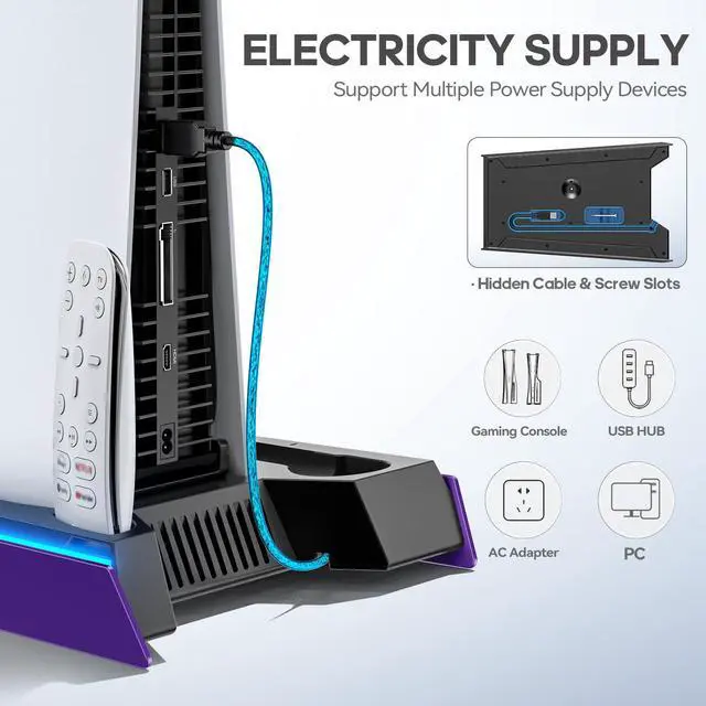 [Versatile Power Solutions] The base of the P5 stand includes an integrated cable that supports multiple power sources, such as USB hubs. Equipped with a smart chip, it prevents overcharging by halting the charge at 80%, protecting against overheating, overcurrent, and voltage fluctuations, thereby extending the lifespan of your PS5 Slim cooling station.