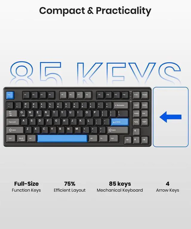 Less Keys, More DeskCrafted for users who value style and functionality, the KN85 series is a game-changer in both aesthetics and performance. As a 75% layout keyboard with 85 keys, it retains essential keys (F1-F12, arrow keys, shortcuts) while omitting the dedicated right-side number pad to keeping its compact form. Ideal for small desks, laptop setups, or anyone looking to maximize desk space efficiency.