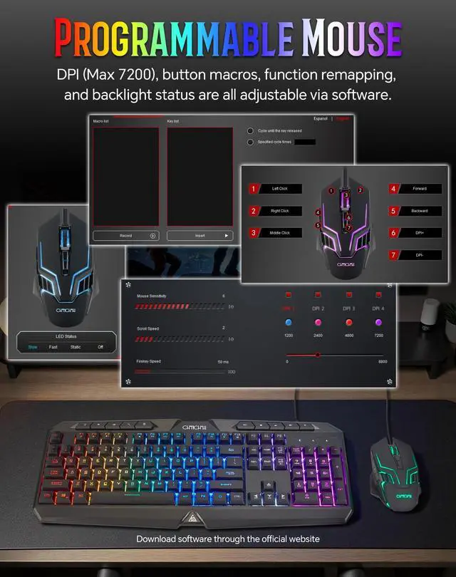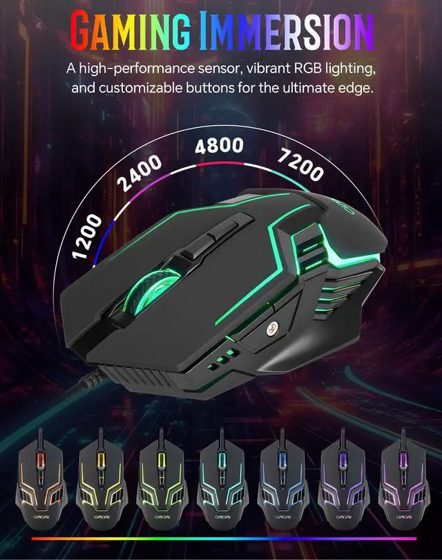 This is a programmable mouse with a USB cable, featuring dynamic RGB lighting and a maximum DPI of 7200.
