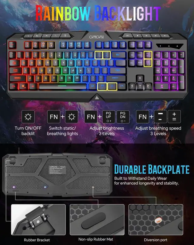 The keyboard has a stable base plate and rubber anti slip pads. The keyboard is waterproof and has multiple water outlets on the back.