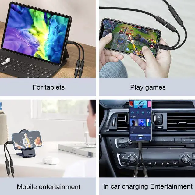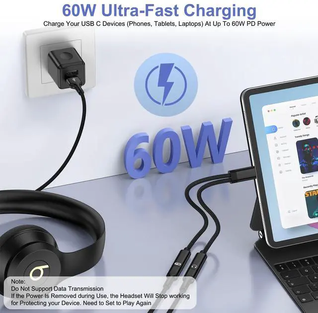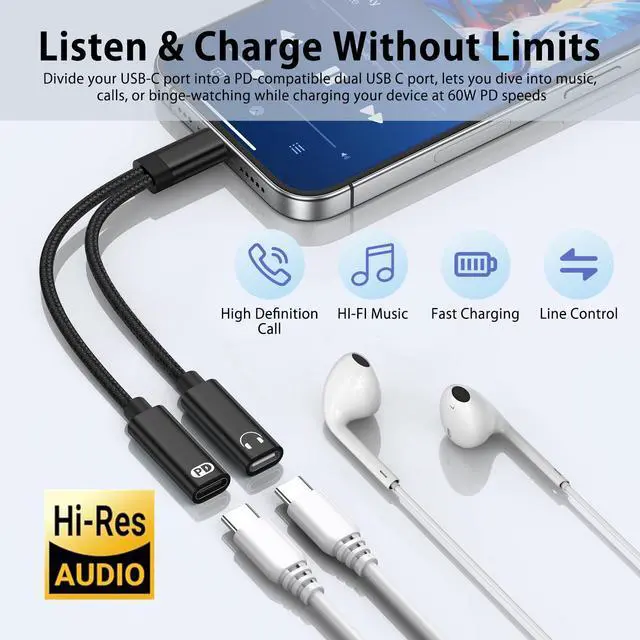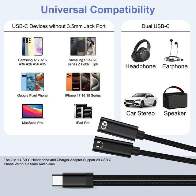 USB C Splitter 1 in 2 out Audio Headphone and Charger Adapter compatible with all USB C devices without 3.5mm jack port.