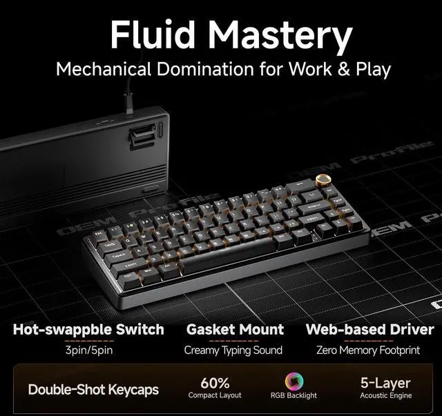 OEM-Profile Keycaps for ergonomic typing comfort. Adjust to three ideal typing angles with the two-stage kickstand. Stay secure and stable with anti-slip rubber feet.