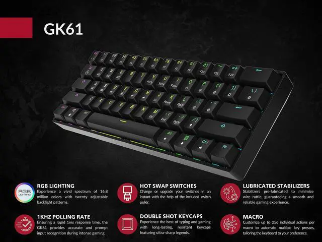 Transform your gaming space with the GK61's dazzling RGB , featuring 16.8 million colors and dynamic patterns. Design your unique gaming environment and assign macros with our user-friendly software.