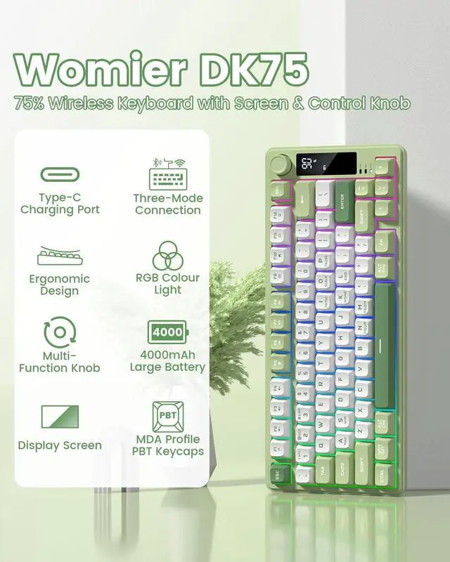 Whether you're upgrading your workspace or enhancing your gaming setup, the Womier DK75 Colorful Membrane Keyboard is designed to meet your needs. Let the creamy keyboard elevate your desk in style. Showcasing Sound, Screen Display, Knob Control, RGB Backlight, Connectivity & Long-Lasting Battery.