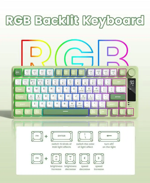 • Cool RGB Backlit Keyboard Effects Personalize your setup with 15 dynamic RGB effects, 7 colors, and adjustable brightness and speed levels. No software requiredcustomize your aesthetic keyboard gaming directly with simple FN+key combination to match your gaming or work vibe