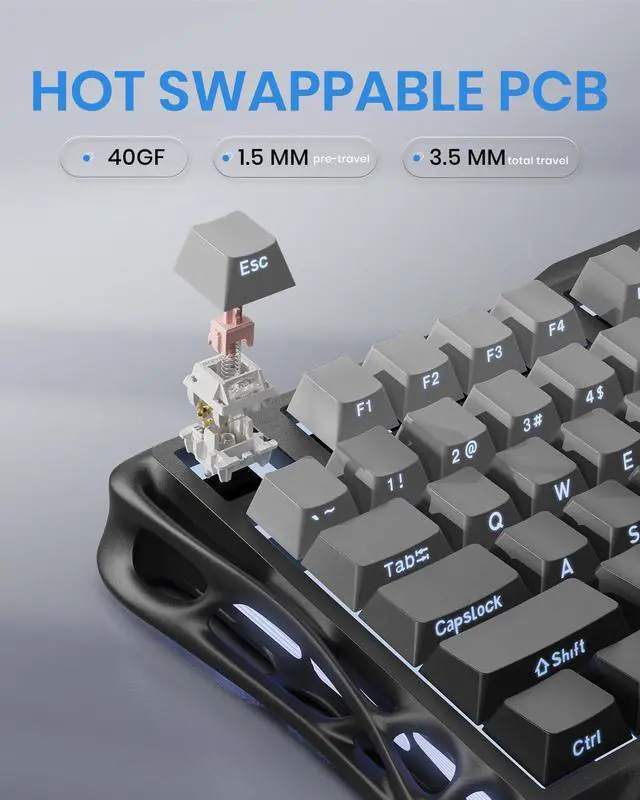 The Mercury K1 custome keyboard includes a custom set of GravaStar x Kailh Linear switches that are perfect for gaming and for typing. The lightweight 40 gf actuation and 1.5mm pre-travel are fast enough for split-second reactions, but forgiving enough to prevent accidental key presses. 3.5mm total travel provides a comfortable typing experience that helps prevent hand fatigue, especially when combined with the K1's flexible PC positioning plate.