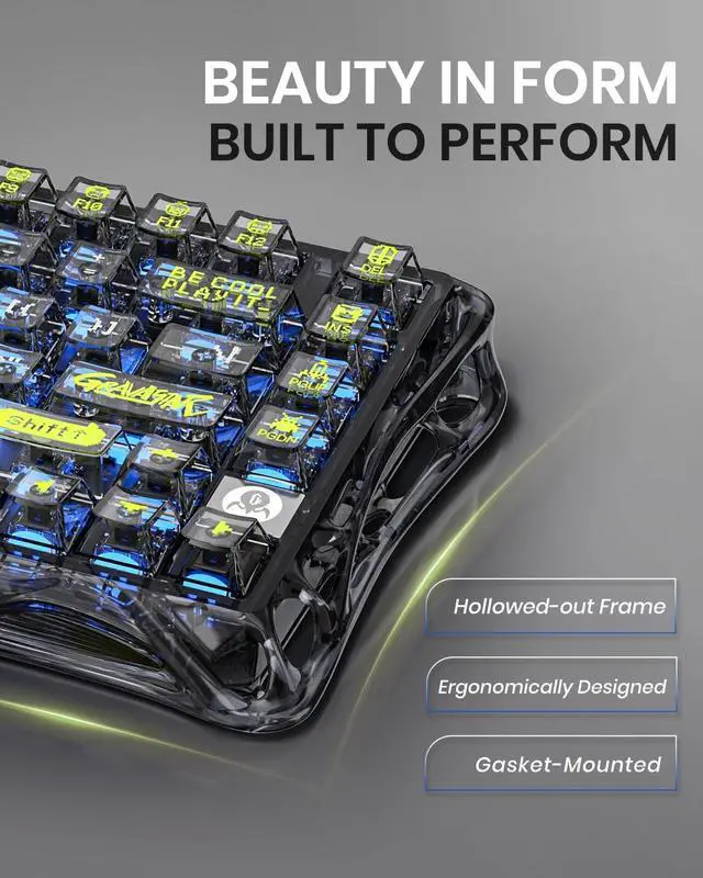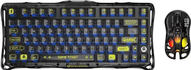 Stylish and Unique Design: The GravaStar Mechanical Keyboard features a hollow and skeletal design that breaks away from traditional keyboard aesthetics, making it a standout piece on any desk. Constructed from durable PVC material, the transparent frame and keycaps maximize the cool backlight RGB effects and wear-resistant appearance.