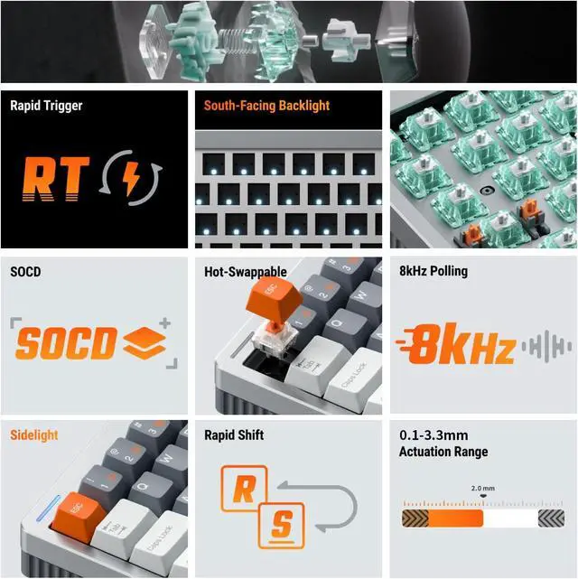 8000Hz Hyper-Polling Rate: 8000Hz hyper-polling response technology transmits keystrokes in an instant, faster than your opponent! Latency is less than 0.3ms, giving you a smoother gaming and office experience.