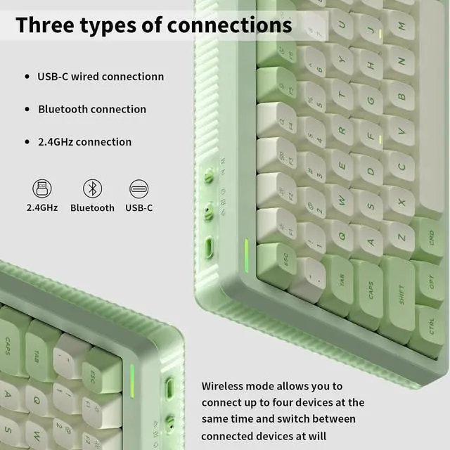 • Multi-device switchingNuPhy Halo96 V2 Wireless Keyboard offers three connectivity options including Bluetooth 5.0, 2.4GHz, and USB C wired modes. The wireless mode allows for up to 4 devices to be connected at the same time,and switch between them easily by FN+ combination keys. Satisfy work, play and study needs.