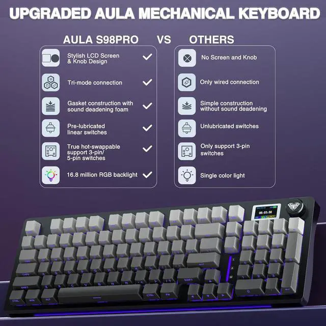 Tri-mode Mechanical Keyboard & Multi-Device Connection: The AULA S98 Pro mechanical gaming keyboard supports BT5.0, 2.4GHz wireless and USB-C wired connectivity to provide reliable and lag-free performance. It can connect up to five devices at the same time and can be easily switched using the knob. The S98PRO wireless gaming keyboard is compatible with Windows, Mac, IOS and Android operating systems, which is suitable for PCs, laptops, tablets, smartphones, PS, XBOX and other devices to meet th