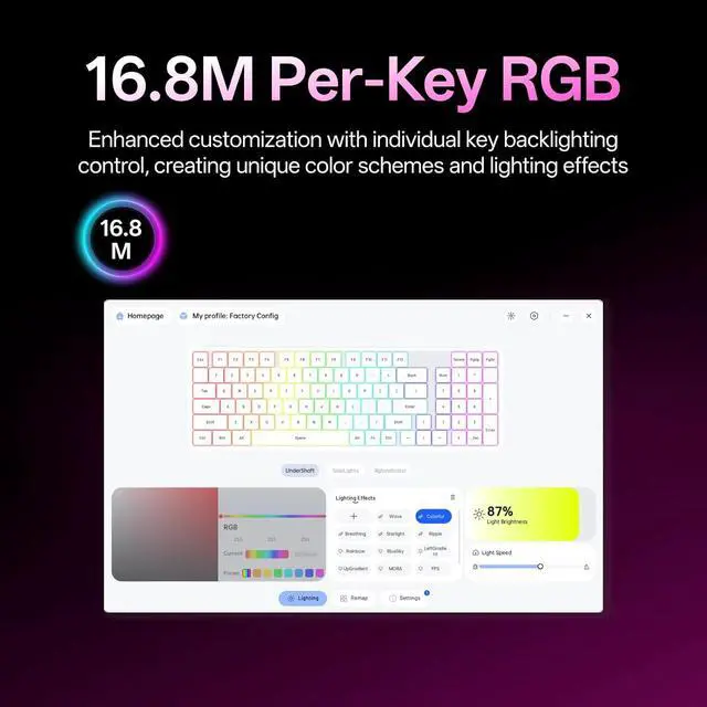 • 16.8M Per-Key RGBProvides enhanced customization with individual key backlighting control, creating unique color schemes and lighting effects synchronized with your personalized setups and in-game events.
