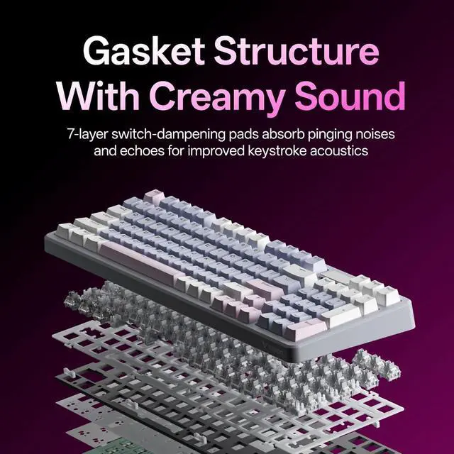• Gasket Structure with Creamy SoundUnique, integrated dampening foam with 7-layer switch-dampening pad structure absorbs pinging noises and echoes for improved keystroke acoustics.