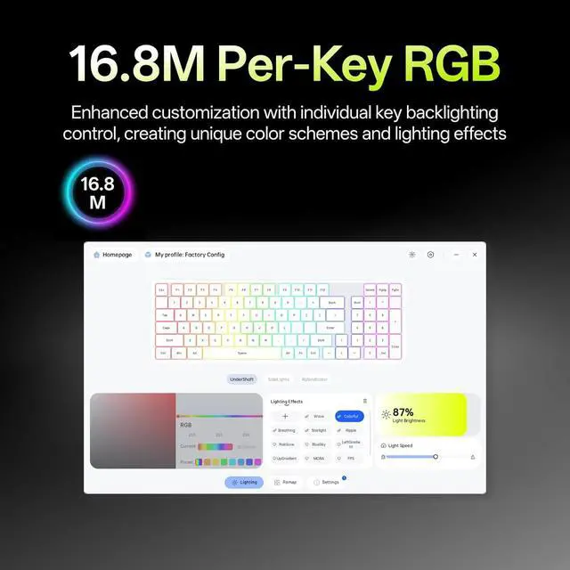 16.8M Per-Key RGBProvides enhanced customization with individual key backlighting control, creating unique color schemes and lighting effects synchronized with your personalized setups and in-game events.