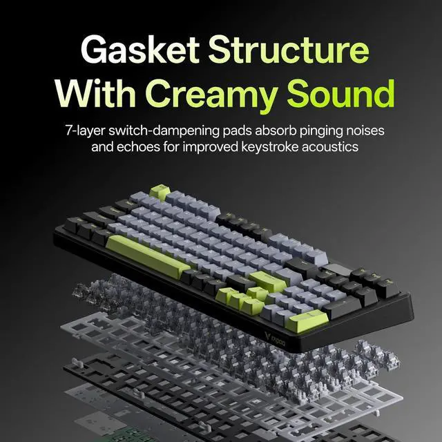 Gasket Structure with Creamy SoundUnique, integrated dampening foam with 7-layer switch-dampening pad structure absorbs pinging noises and echoes for improved keystroke acoustics.