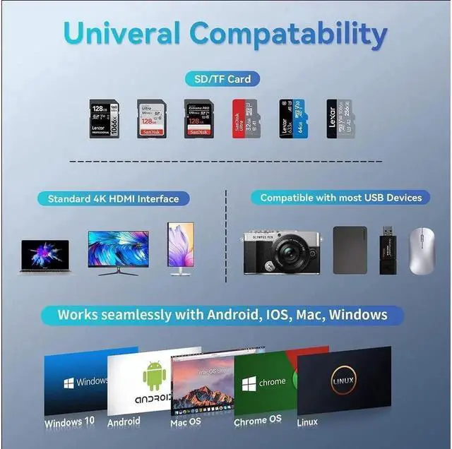Superspeed Data Transfer- This ucb c docking station built-in 3* USB 3.0, syncs data at blazingly fast speeds up to 5Gbps, fast enough to effortless data transfer? 1G songs, movies, or files in just seconds. In addition, you can connect the USB driver or mouse without any lag via USB 2.0 ports. Its slim and compact body also inserts SD and TF slots for easy access to files from universal SD and Micro SD Memory Card, support 2 cards reading simultaneously.