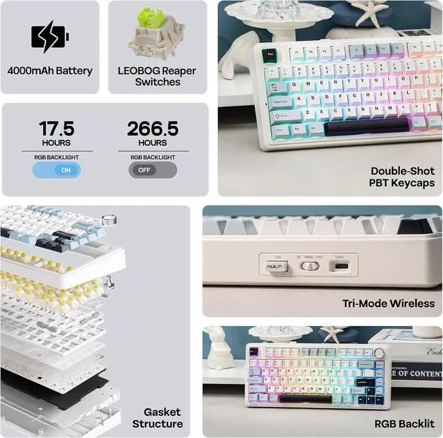 Three-Way Connectivity for Every Scenario&4000mAh BatteryOffering BT, 2.4GH z wireless, and wired USB connectivity, the F75 adapts to your specific needs. Whether it' s for a clutter-free wireless setup or a stable wired connection, this keyboard is ready for any situation. Equipped with a large 4000mAh battery, the F75 delivers extended usage times. This generous battery capacity ensures that your keyboard is always ready for long work sessions or intense gaming marathons.