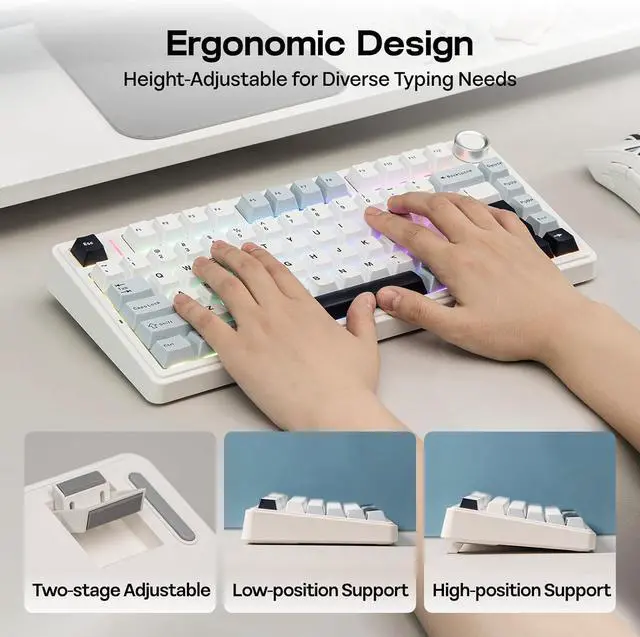 Finely-Calibrated Stabilizers&Cherry Profile Double-shot PBT KeycapsDiscover refined keystrokes with our precision-tuned stabilizers, offering stability and a hushed typing experience. Say goodbye to key wobble as your keystrokes gain enhanced accuracy. The F75 takes durability to the next level with its Cherry-profile double-shot PBT keycaps, ensuring a perfect blend of robustness and stylish design. These keycaps stand resilient against wear, maintaining a sleek appearance that defies the test of time.