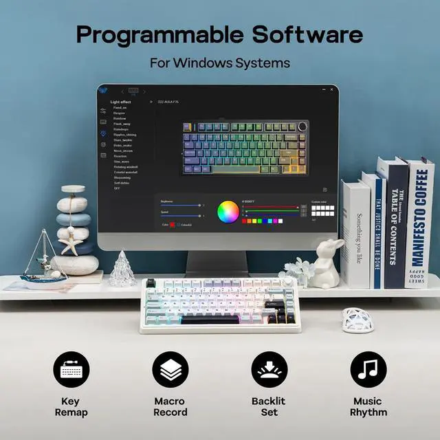 Ultra-Responsive Low-Latency&Vibrant 16.8M RGB IlluminationEngage in the dynamic glow of the F75' s RGB backlight, presenting a rich spectrum of 16.8 million colors for a personalized typing environment. Tailor lighting patterns to suit your preferences, creating a desktop atmosphere that adapts to your mood. With its ultra-responsive, low-latency connection, the F75 ensures each keystroke is not only vividly illuminated but also delivered with swift and unwavering precision, whether you' re gaming or typing away.