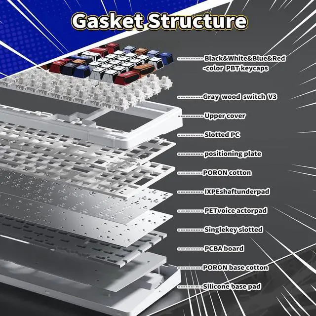 Cool Keyboard Wireless RGB Backlit: This bluetooth computer keyboard features a gasket structure, extended integrated silicone pad and PCB single key slotting, rapid trigger mode making the hand feel softer and more elastic. Lighting brightness and speed can be adjusted by the FN+key combination. Five layers of filling silencer fills the gap between the PCB, the positioning plate and the shaft, effectively counteracting the cavity noise sound of the shaft hitting the positioning plate. With Macro soft, you can create unique lighting setup to make your rgb keyboard more interesting and create a personalized work or gaming environment.