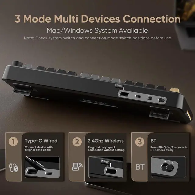 Triple Mode Multi DeviceIt can not only get rid of the cord shackles for a fast typing experience, but also meet the extreme speed experience of wired mode when charging. With the flip of 2 switches on the top, you can seamlessly switch between different devices in WINDOWS, MacOS, 2.4G wireless, wired and BT modes, giving you the freedom to move between different spaces. (Note: FN+Q/W/E to switch between BT1 /BT2/BT3 device. Not recommended for accountants or other numerical workers).