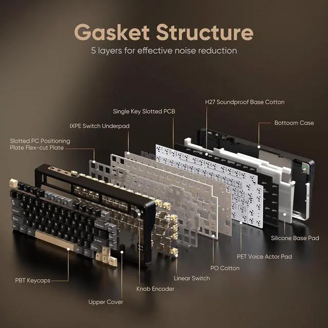 Satisfying Creamy SoundGasket keyboard truly shines with its distinctive construction and superior performance in mechanical keyboards. Compared to Top-Mount Design, the Gasket Design has five-layer shock absorption and a single-key positioning plate. The unique design allows for a more even keystroke feel on the keyboard and enables full-key anti-ghosting. This results in a softer and more comfortable typing experience. It will be ideal for gamers and typists alike.