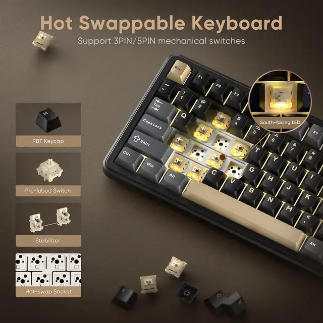 Hot Swappable SwitchesThe hot-swappable keyboard is a game-changer! Built-in hot-swap PCB lets you replace 3-pin or 5-pin switches without soldering, giving you a wide choice. Built-in pre-lubricated pink shafts make typing smooth and comfort. Comes with spare pre-lubricated shafts and a key puller for you to experiment with different switches freely to find the perfect feel for your typing style or gaming needs