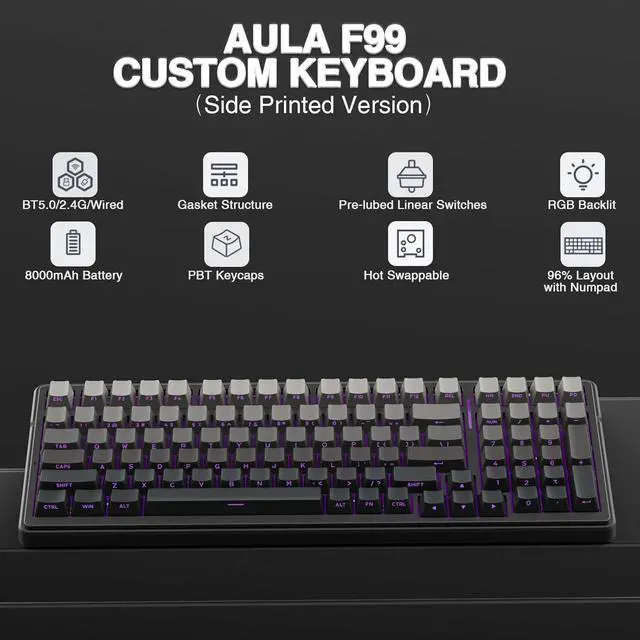 Tri-mode Connection Keyboard: AULA F99 wireless mechanical keyboards work with Bluetooth, 2.4GH z wireless and USB wired connection, can connect up to five devices at the same time, and easily switch by shortcut keys or side button. F99 computer keyboard is suitable for PC, laptops, tablets, mobile phones, PS, XBOX etc, to meet all the needs of users. In addition, the rechargeable keyboard is equipped with a 8000mAh large-capacity battery, which has long-lasting battery life