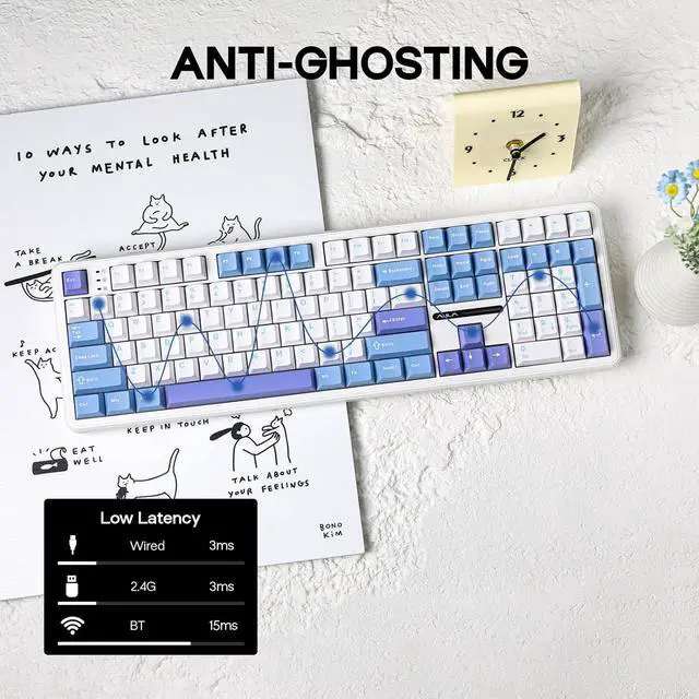 Wireless Keyboard with Limitless Compatibility: Packed with 4000mAh rechargeable batteries, double the power average gaming keyboard offers, F108 Wireless Keyboard grants up to 100 hours of continuous gameplay at peak performance with backlight off. Its versatile BT mode offers swift transaction from PC, Mac Laptop to Android Tablet, while the 2.4GH z wireless and USB Cable mode promise competitive-level stability and responsiveness with 1000Hz polling rate