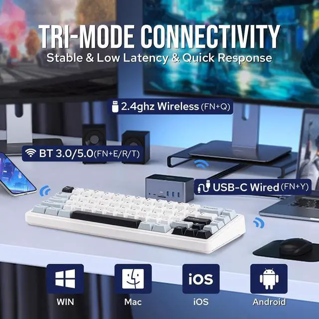 Three-Way Connectivity & Long-Lasting 4000mAh BatteryThe F65 offers versatile three-way connectivity options: BT, 2.4GH z wireless, and wired USB, making it adaptable to any scenario. Whether you prefer a clutter-free wireless setup or the reliability of a wired connection, the F65 has you covered. With its large 4000mAh battery, the F65 delivers extended usage times, ensuring it' s always ready for long work sessions or intense gaming marathons