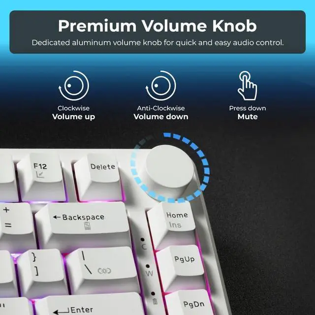PREMIUM PBT KEYCAPS & VOLUME KNOB: Durable double-shot PBT keycaps resist shine and wear, maintaining a premium texture over time. A dedicated aluminum volume knob allows for instant audio adjustments, giving you full control over your media without interrupting your game or workflow.