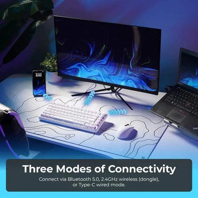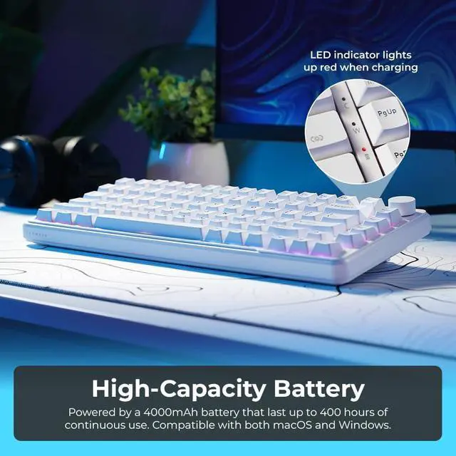 TRI-MODE WIRELESS CONNECTIVITY: Seamlessly switch between Bluetooth 5.0, low-latency 2.4GH z wireless, and USB-C wired modes. Whether you are gaming on a PC, typing on a Mac, or multitasking across devices, this wireless mechanical keyboard ensures a stable, lag-free connection.